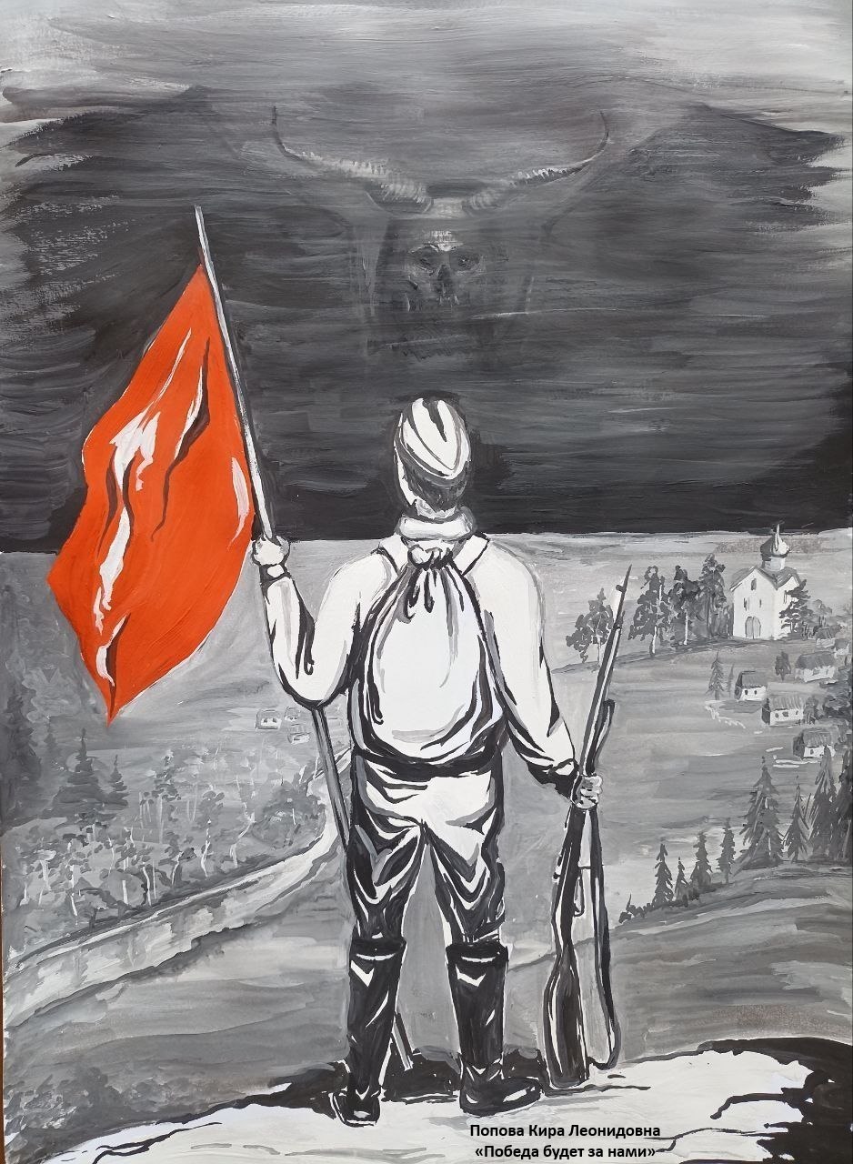 - Попова Кира Леонидовна (ДШИ, 9–12 лет) — работа «Победа будет за нами»;